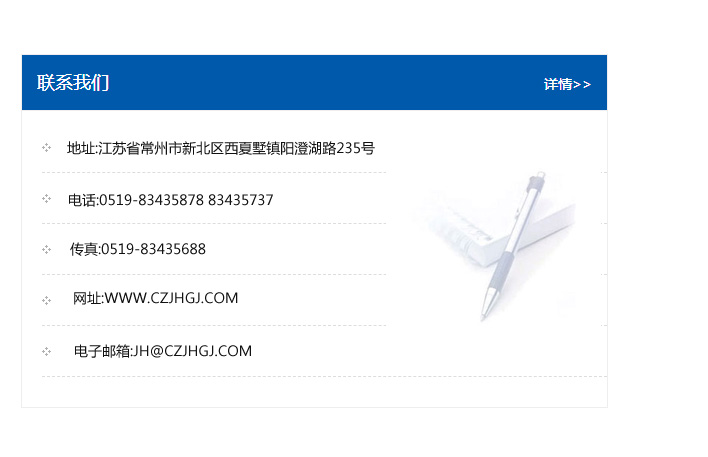 傳真:0519-83435688    郵編:213135    網址:WWW.czjhgj_com.kmry8.com    電子郵箱:JH@czjhgj_com.kmry8.com